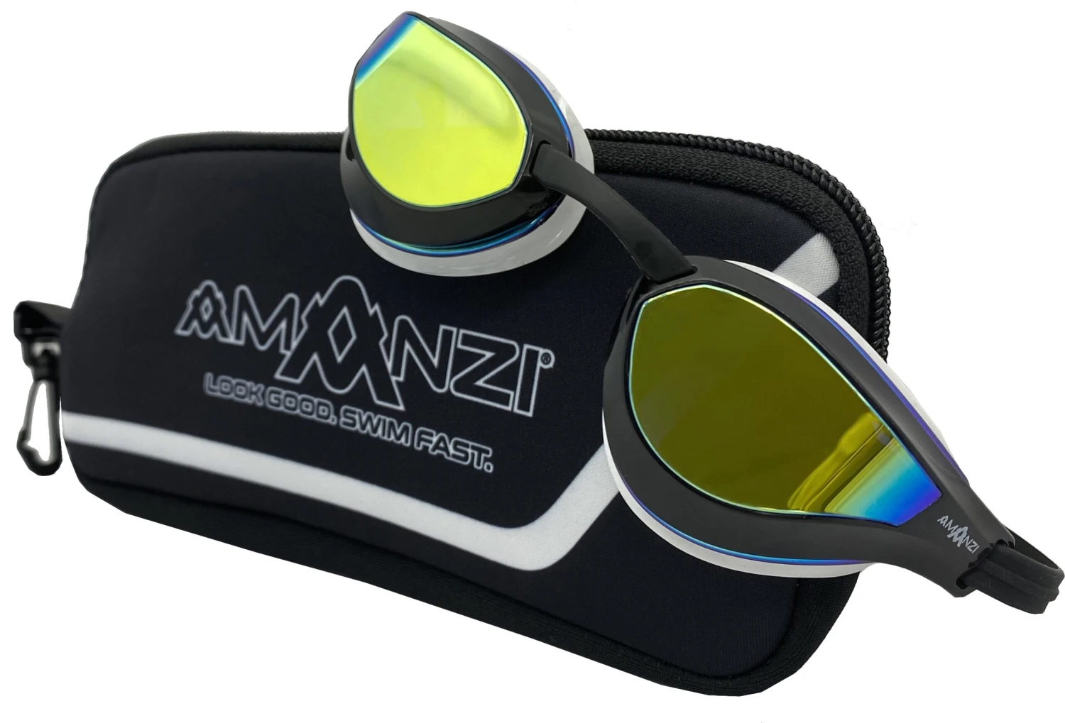 The AMANZI Dominate Prismatic Mirror Goggles – are a sleek high tech racing goggle with a low lens profile and hydrodynamic design ensuring minimal drag when swimming. The soft TPE gasket provides a comfortable seal around the eyes meaning these can also be worn during swim training sessions. These goggles come with a reusable neoprene case to ensure your goggles are kept safely stored between swims.