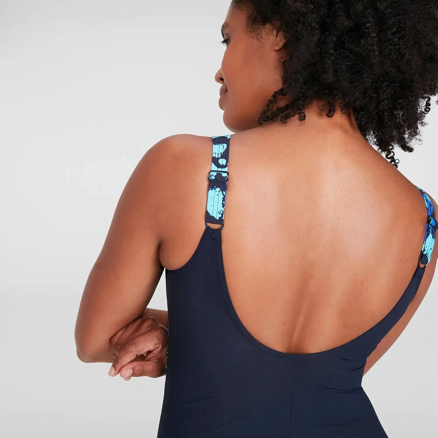 Enhances, flatters and feels good all over. The sporty-look navy LunaLustre swimsuit features a squared neckline and a flattering scooped back. A bright blue patterned print runs from the strap to the waist, creating a contouring effect that narrows the waist. Made using exclusive lightweight all-over shaping fabric with tummy control, it smooths and flatters in all the right places. Adjustable straps ensure a great fit while the under-bust seam and shaping fabric provide a comfortable, supportive fit. Perfect for your regular workout, it includes LYCRA® XTRA LIFE™ which is ultra-chlorine resistant and lasts twice as long as standard swimwear fabric.